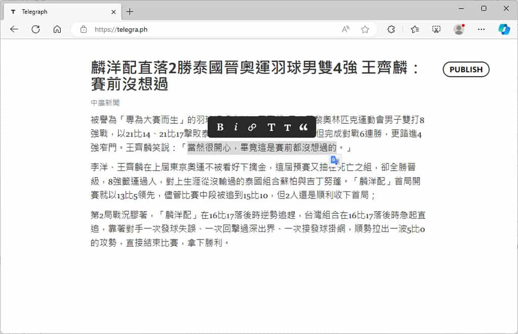 5.完成後,可按頁面右上角的「Publish」發布文章。這篇文章的網址就會顯示在瀏覽器的網址列,按「EDIT」還可以重新編輯。