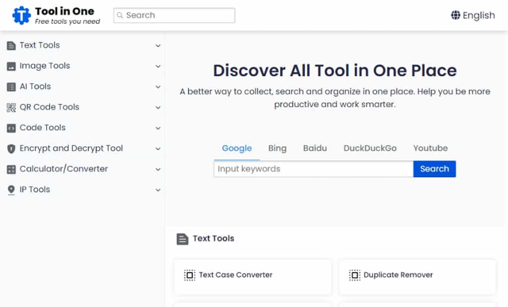 ToolinOne 是一個集合多種實用工具的免費平台,主要可讓使用者在一個網站上完成各類任務。這個網站匯集了從搜尋引擎到各種實用工具,為使用者提供了便捷的使用體驗。在 ToolinOne,使用者只需輸入關鍵字,即可選擇使用 Google、Bing、百度、DuckDuckGo 和 YouTube 等熱門搜尋引擎。除此之外,ToolinOne 還提供了八大類工具,包括 Text Tools、Image Tools、AI Tools、QR Code Tools、Code Tools、Encrypt and Decrypt Tools、Calculator & Converter 及 IP Tools。這些工具原本分散在不同的平台上,使用者需要花費時間去尋找和試用。現在,ToolinOne 把這些工具集成到一個網站上,讓使用者不再需要繁瑣的搜索和切換,大幅簡化了使用過程,從而顯著提升了工作效率。