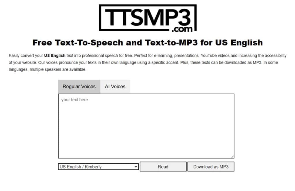 1.前往網站(https://ttsmp3.com/),切換 Regular Voices 或 AI Voices,貼上英文、中文或其他語言文字。