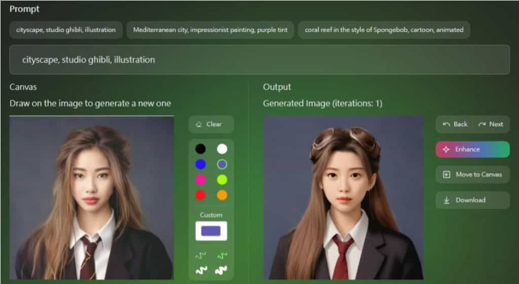 4.「Enhance」按鈕,可以提供圖片清晰度且讓主角看起來更立體;而「Move to Canvas」按鈕,可以快速地將生成圖片轉為原始圖片,方便繼續變化。