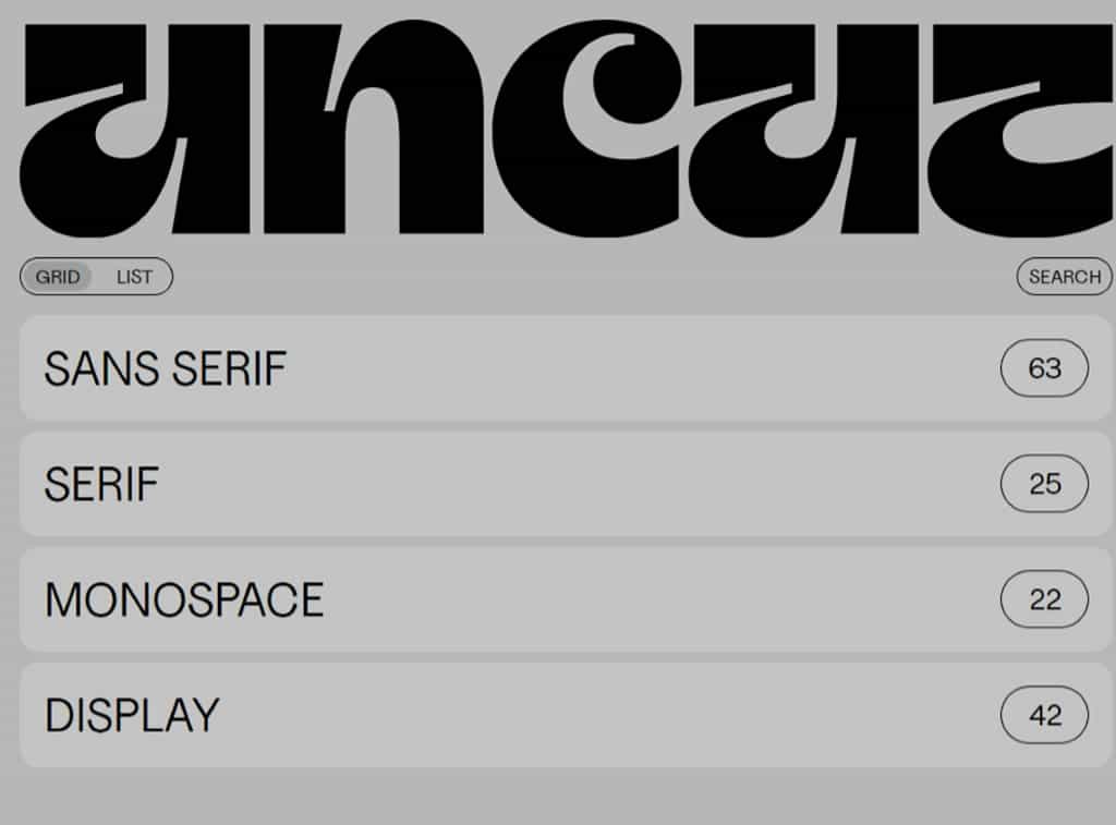 1.進入 UNCUT wtf 字型平台,可以看到其提供的四種主要字型,包含 Sans Serif(無襯線)、Serif(襯線)、Monospace(等寬)及 Display,後面的數字是該字型擁有的字體數量。