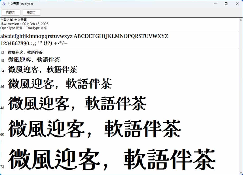 首頁免費字型中文字型 宇文天穹字型:融合明體、黑體與書法之美的繁體中文開源字體 「宇文天穹(UoqMunThenKhung)」 是一款為繁體中文環境所設計的開源字型,由香港 VTuber 宇文滿月製作。該字體以日本「解星計劃」開發的 「解星」字型為基礎,並參考《傳承字形標準化文件》的推薦形體,進行傳統字形的最佳化與調整,同時補足缺失的漢字,確保完整的繁體字支援。宇文天穹的設計風格融合了明體、黑體、圓體與書法元素,展現出獨特的視覺美感。其橫細豎粗的特徵及橫筆末端的小圓形,顯然承襲自明體風格;而左上角、右上角與左下角的設計,則具有黑體的俐落感。同時,右下角和撇、捺、鈎等筆畫的弧度,巧妙融合圓體的流暢感與楷書的柔和韻味,使整體字形既端正典雅,又不失親和力,適合廣泛應用於各類繁體中文設計場景。 🔔 不錯過任何精彩! 立即訂閱我們的 LINE 官方帳號 每次發佈新文章時,您將會第一時間收到本站文章連結通知,輕鬆掌握最新資訊! 使用 LINE 追蹤文章更新 §相關文章,還可以參閱:字言字型免費中文字體1—手繪體:融合宋楷雙韻的手繪塗鴉字型,免費可商用結合傳統與現代美學的台灣日曆字型「日曆體」免費開源下載荊南麥圓體 KN Maiyuan:可愛圓潤的免費商用中文字體LINE Seed TW:圓潤親切的繁體中文字體,不但免費還可商用香萃刻宋:免費可商用的仿古雕刻宋體字型,展現濃厚人文與視覺張力 由香港 VTuber 宇文滿月打造,基於「解星」字型優化,完美呈現傳統字形 1.進入「宇文天穹」字型的 Github 網頁,在頁面點擊「🌕 宇文天穹 Version1.001 下載 🌕」鏈結,再按說明,即可下載。 2.滑鼠右鍵點擊所下載的檔案,即可再出現的功能表選擇「預覽」或「安裝」。 也可以預覽後再左上角點擊安裝。 3.完成安裝後,如果是使用 Windows 作業系統,可以在設定 > 個人化 > 字型,管理剛剛安裝的字型。 4.也可以輸入要預覽的文字,看字型的展示效果。 宇文天穹字型不僅保留了傳統漢字的美感,還巧妙融合了多種字體風格,使其在可讀性與藝術性之間取得完美平衡。作為一款開放原始碼字型,它不僅適用於印刷設計、UI 介面、標題字等多種應用場景,也為繁體中文使用者提供了一個免費且有品質的字體選擇。 宇文天穹(UoqMunThenKhung)官方網站:https://github.com/MoonlitOwen/ThenKhung