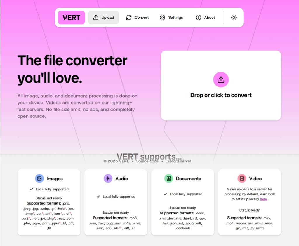 VERT 是一個聚焦在圖片、影音及文件行檔案的轉檔線上工具,採用 WebAssembly 技術,將所有檔案處理程序直接在使用者的瀏覽器中執行,完全擺脫了傳統線上轉檔服務對雲端伺服器的依賴。透過 WebAssembly 技術,VERT 能夠在本地裝置上使用 Fmpeg(音檔、影片)、Imagemagick(圖像)和 Pandoc(文件)處理圖片、影音和文件格式轉換,大幅提升轉檔速度,更重要的是確保了使用者檔案的絕對隱私安全。