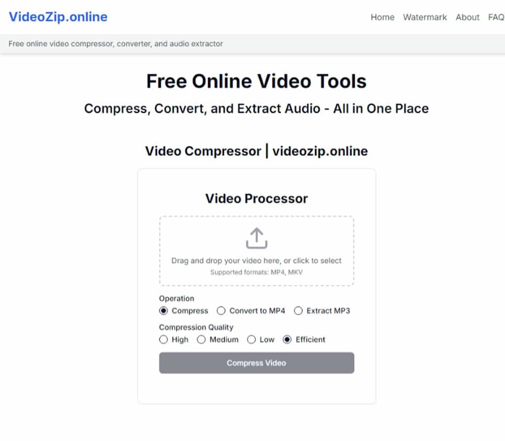 VideoZip.online 是一個免費的線上影片工具,專為影片壓縮、轉 MP4 和提取音訊而設計。使用者只需選擇要處理的影片,就可以選用上述三項功能。根據 VideoZip.online 的網站說明,這個免費工具的所有處理過程都在使用者設備內的瀏覽器內完成,影片檔案不會被上傳到遠端伺服器進行處理或儲存,確保隱私和檔案安全性。此外,使用 VideoZip.online 無需註冊,沒有使用次數限制,且全程無廣告干擾,提供了流暢的使用體驗。