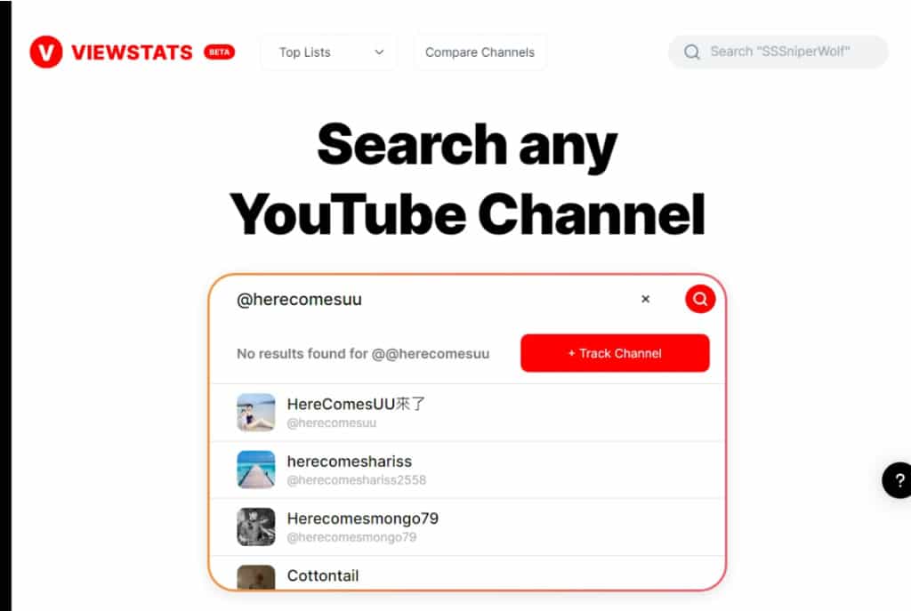 2.進入 Viewstats 網站,輸入頻道名稱,雖是標榜 Search any YouTube Channel,但並非每個頻道都能有分析數據,以上述的「HereComesUU來了」為範例,其頻道名稱為:@herecomesuu,輸入後,Viewstats 會自動找出相類似的頻道名稱,讓使用者選擇。
