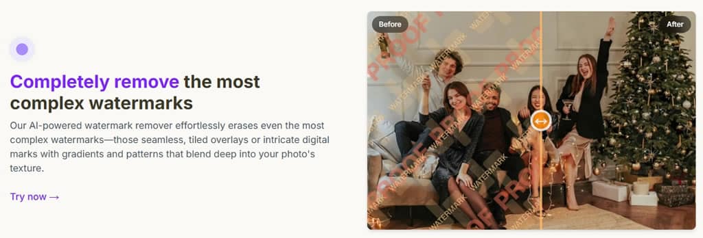 WatermarkZero 的核心優勢在於其強大的 AI 辨識與修復能力,能夠處理市面上所有類型的浮水印挑戰。從簡單的文字浮水印到複雜的圖案水印,從不透明的商標標誌到幾乎隱形的半透明覆蓋層,這款工具都能完美處理而不留任何痕跡。其採用的真正智慧修復技術 (True Inpainting Technology) 不僅僅是單純的浮水印移除,更重要的是能夠智慧分析周圍像素的紋理、色彩和光線脈絡,進而重建浮水印背後的像素內容,讓修復後的圖片呈現極為自然的效果。