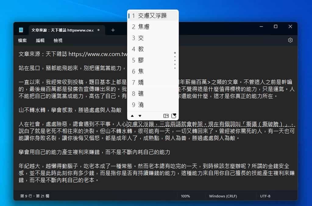 首頁操作技巧Microsoft 「Windows 記事本」重新組字功能,輕鬆更正錯別字,免去重新輸入 現在輸入法大多具備自動選字功能,但不能保證不會出現錯誤,如果在完成內容後發現有錯別字,通常就是刪掉後再重新輸入。但如果是注音符號正確但字選錯的情況,例如「在」與「再」,那麼,在記事本中有個「重新組字」功能,可以讓使用者直接重新選字或詞,而無需先刪除再重新輸入,大幅縮短校稿時間。 🔔 不錯過任何精彩! 立即訂閱我們的 LINE 官方帳號 每次發佈新文章時,您將會第一時間收到本站文章連結通知,輕鬆掌握最新資訊! 使用 LINE 追蹤文章更新 §相關文章,還可以參閱:Windows 記事本大更新!表格、AI 串流一次到位,升級方法看這篇微軟大逆轉!Windows 10 延長安全更新攻略:免費再戰一年的三大秘訣「Microsoft Office 365 教育版」 讓符合資格的學生都可免費註冊使用如何透過「網路連線磁碟機」連結到 OneDrive 雲端硬碟內的資料夾?如何在部落格或網頁內嵌 OneDrive 資料夾? 操作步驟: 1.下圖這篇文章段落來自天下雜誌。 2.假設「焦慮」當初選錯字成「交慮」,這時候,只需要將游標焦點置於「交慮」前方,再按滑鼠右鍵,叫出快速功能表,點選「重新組字」功能。 3.此時,記事本會選取包含「交慮」後方的段落成輸入狀態,讓使用者可以重新選字。 4.只要是利用「重新組字」功能,重回輸入狀態段落內的字都可以重新挑選。 使用「Windows 記事本」利用重新組字功能,可以快速解決因挑字錯誤所產生的錯別字,節省需先刪除再重新輸入的時間。