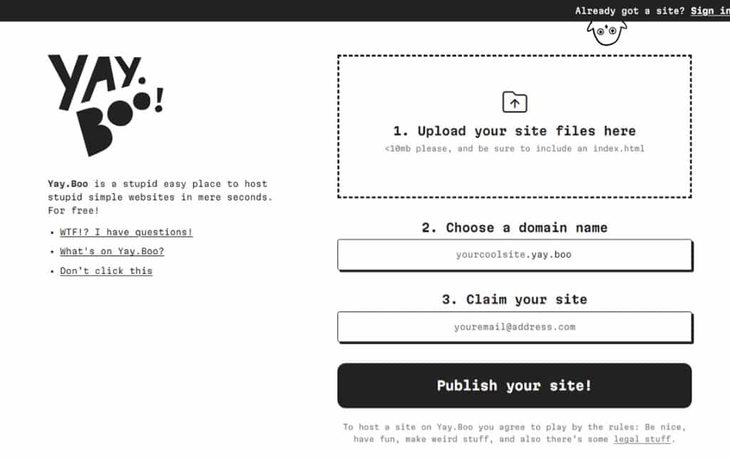 Yay Boo 是一個免費網站搭建工具,讓使用者輕鬆建立屬於自己的個人網站。除了提供 10 MB 的免費空間,還能在 yay.boo 主網域內自訂子網域名稱,例如:chtouch.yay.boo。使用流程非常簡單,使用者只需上傳包含 index.html 的網站檔案,設定想使用的子網域名稱,並輸入電子郵件,即可完成網站搭建。若後續需要管理網站,使用最初提供的電子郵件即可登入進行管理。雖然免費空間只有 10 MB,但圖片等媒體檔案可以透過外部連結來節省空間,對於網站初學者或是想要建立個人網站的人來說,還是一個不錯的選擇。