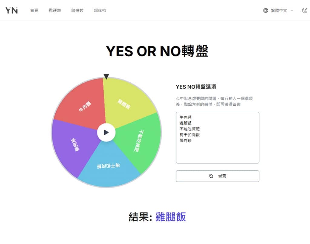 當面對「吃什麼?」、「選哪個?」這類日常抉擇時總是難以決定,不妨試試看 YesOrNo 這個免費又有趣的線上轉盤工具,不只幫你在「是」與「否」之間抉擇,更支援自訂選項,像是「火鍋」、「拉麵」、「便當」等等,讓轉盤幫你輕鬆做決定。操作方式簡單直覺,只需輸入選項並點擊轉盤中間的按鈕,轉盤旋轉後就會自動選出結果,讓選擇變得有趣又有依據。